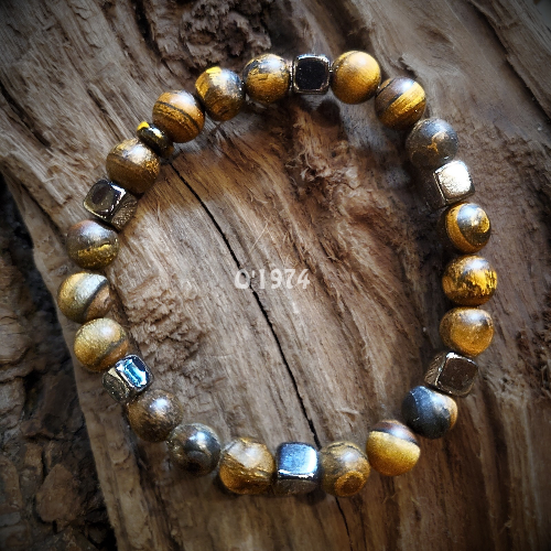 Bracelet 8mm en œil de tigre mat et cubes d hématite. Cache-noeud en corne.