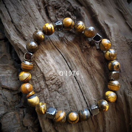 Bracelet 8mm en œil de tigre mat et hématite. Cache-noeud en corne.