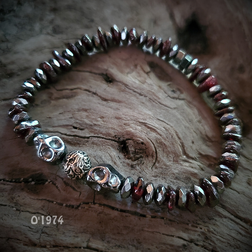 Bracelet 7mm composé d'hématite et de pépites de grenat. 2 skulls hématite, 1 perle centrale compression en étain argenté et patiné de fabrication américaine.